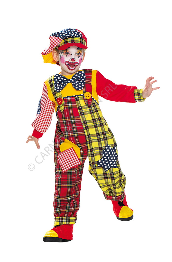 Simoatico costume Clown curato nei minimi dettagli, composto da una coloratissima tutona e cappellino a tema
