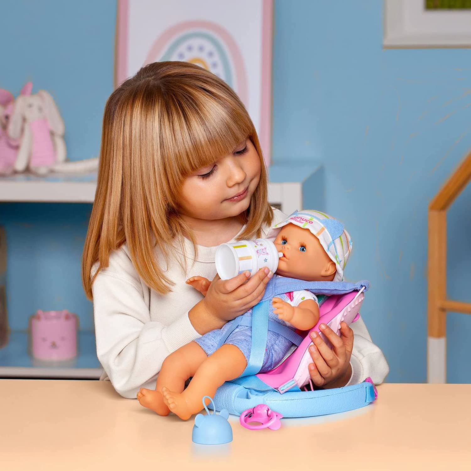 La confezione giocattolo contiene accessori come ciuccio, sonaglio e biberon; oltre allo zaino regolabile dove potrai riporre tutti