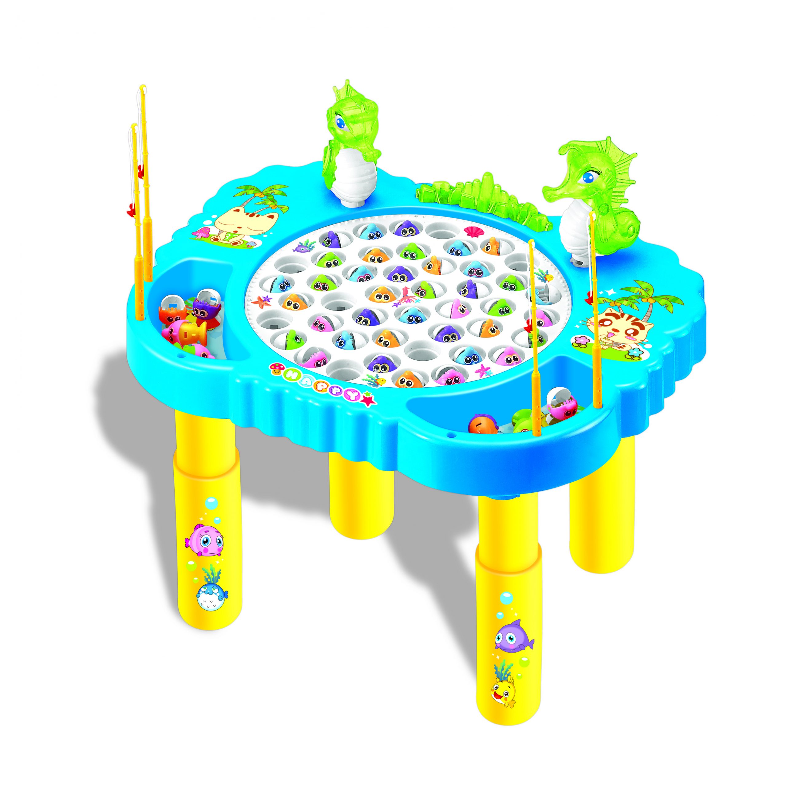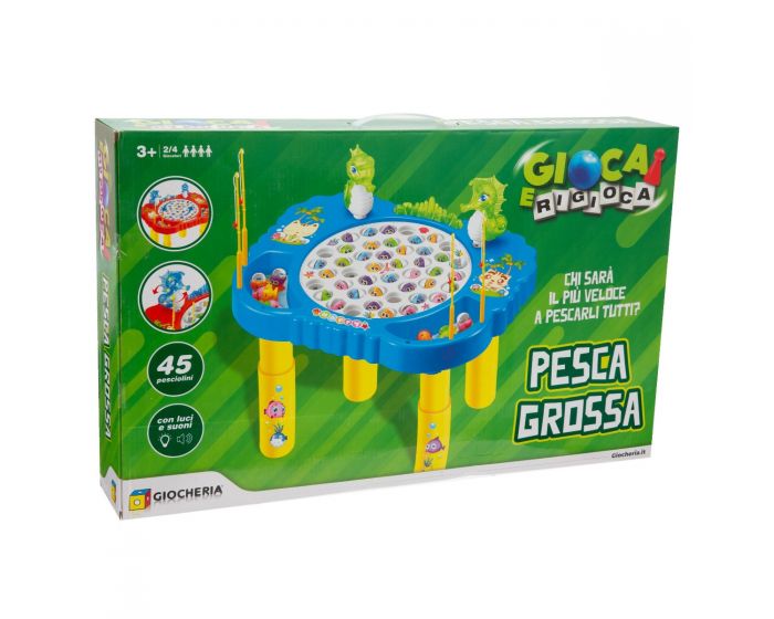 Base di gioco del classico pesca pesci in una versione a tavolino, con luci e suoni. Include tavolino con base di gioco ed elementi decorativi, 45 pesciolini e 4 canne da pesca. Num. Giocatori: 2-4