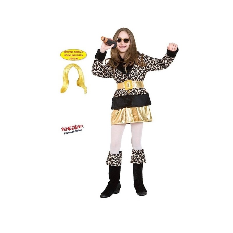 Adorabile costume da carnevale bimba HANNAH SUPERSTAR , composto da giacca in vellutino leopardato, bordato da pellicciotto nero, cintura e gonna in tessuto laminato, copriscarpe, microfono, occhiali e parrucca.